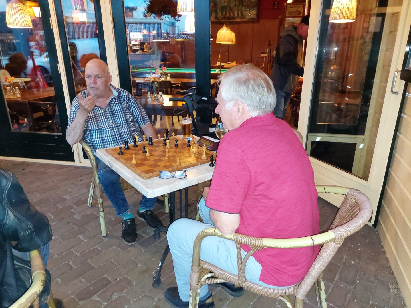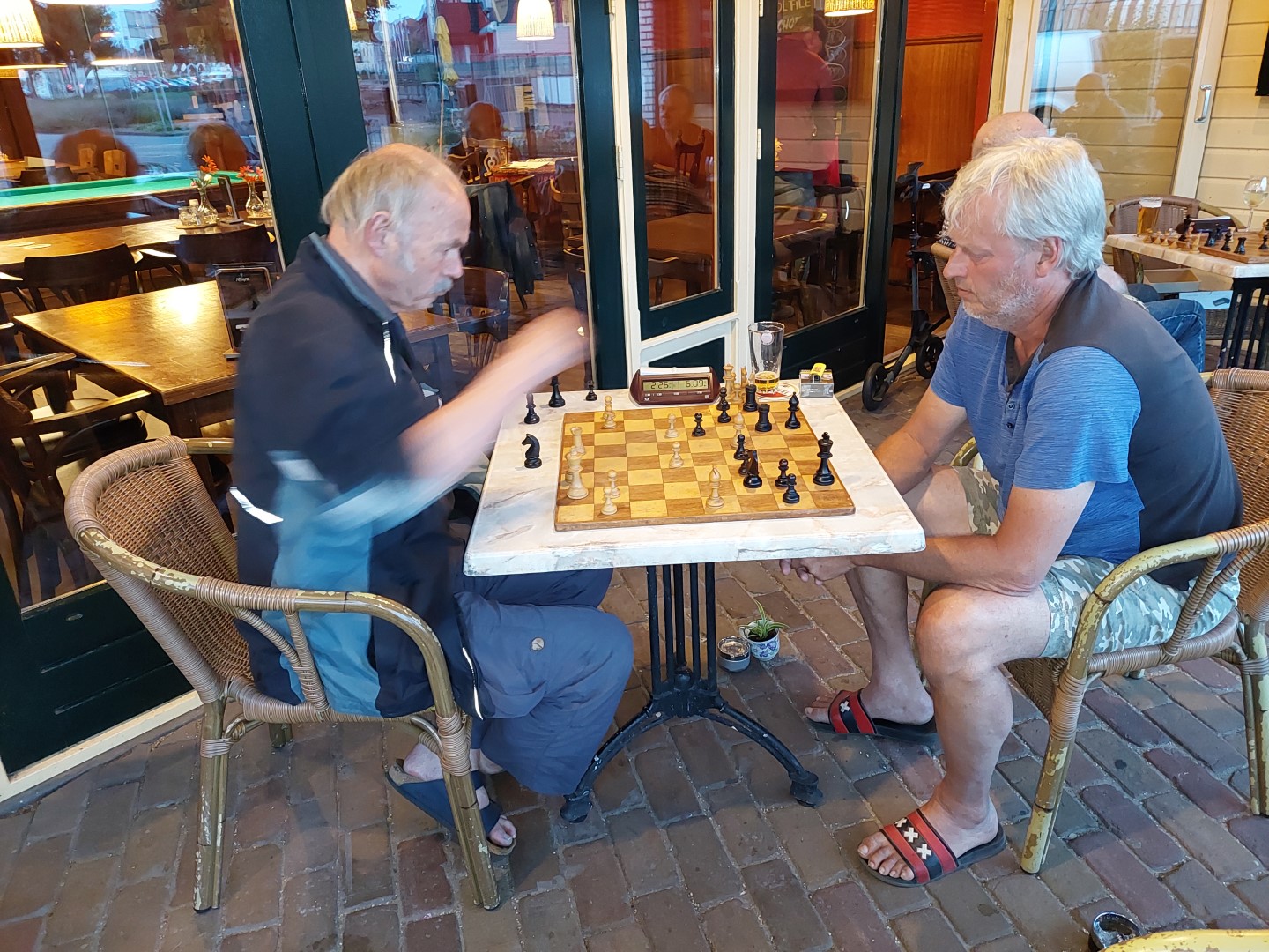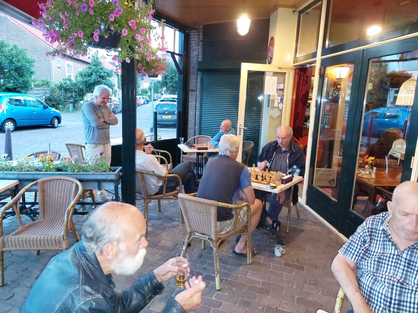 Het Zomerschaak bij Het Paard van Ree trekt altijd weer enthousiaste spelers aan uit de regio. Cor Zwaan is een graag geziene gast. Vorige week stuurde Bakkum een hoge delegatie naar Wijk aan Zee: Han Kemperink en Fons Vermeulen. Vrolijk draaiden ze mee met de 10-minuten potjes. Uitslagen en standen hebben we deze zomer niet, maar het bier smaakte er niet minder om!