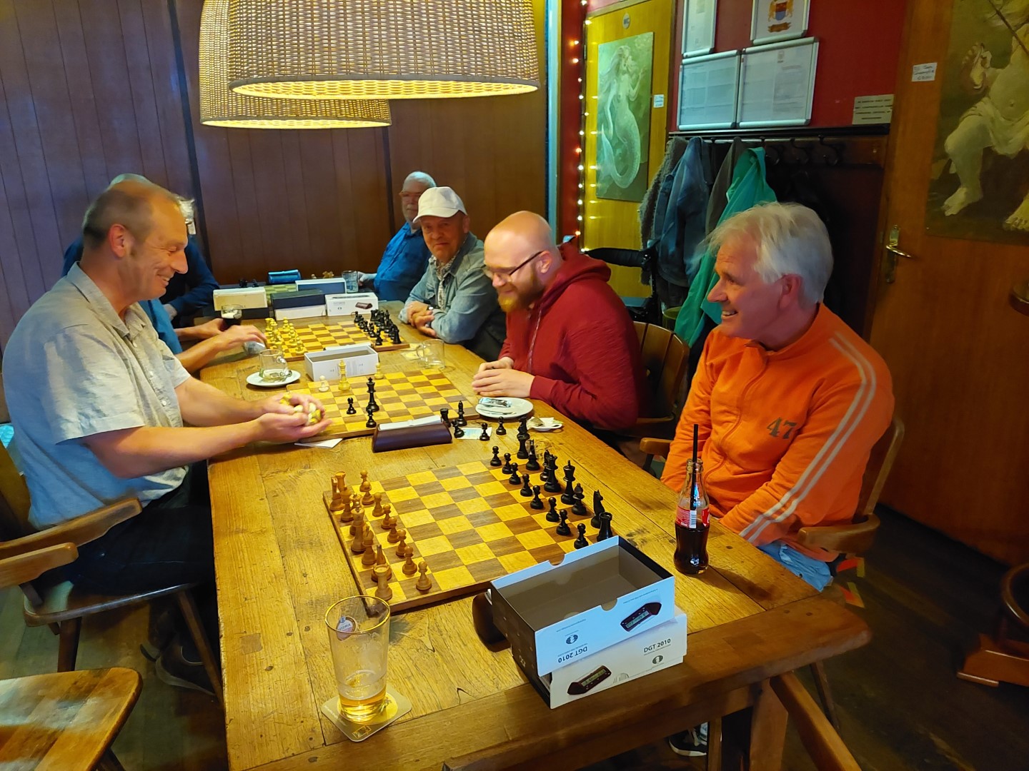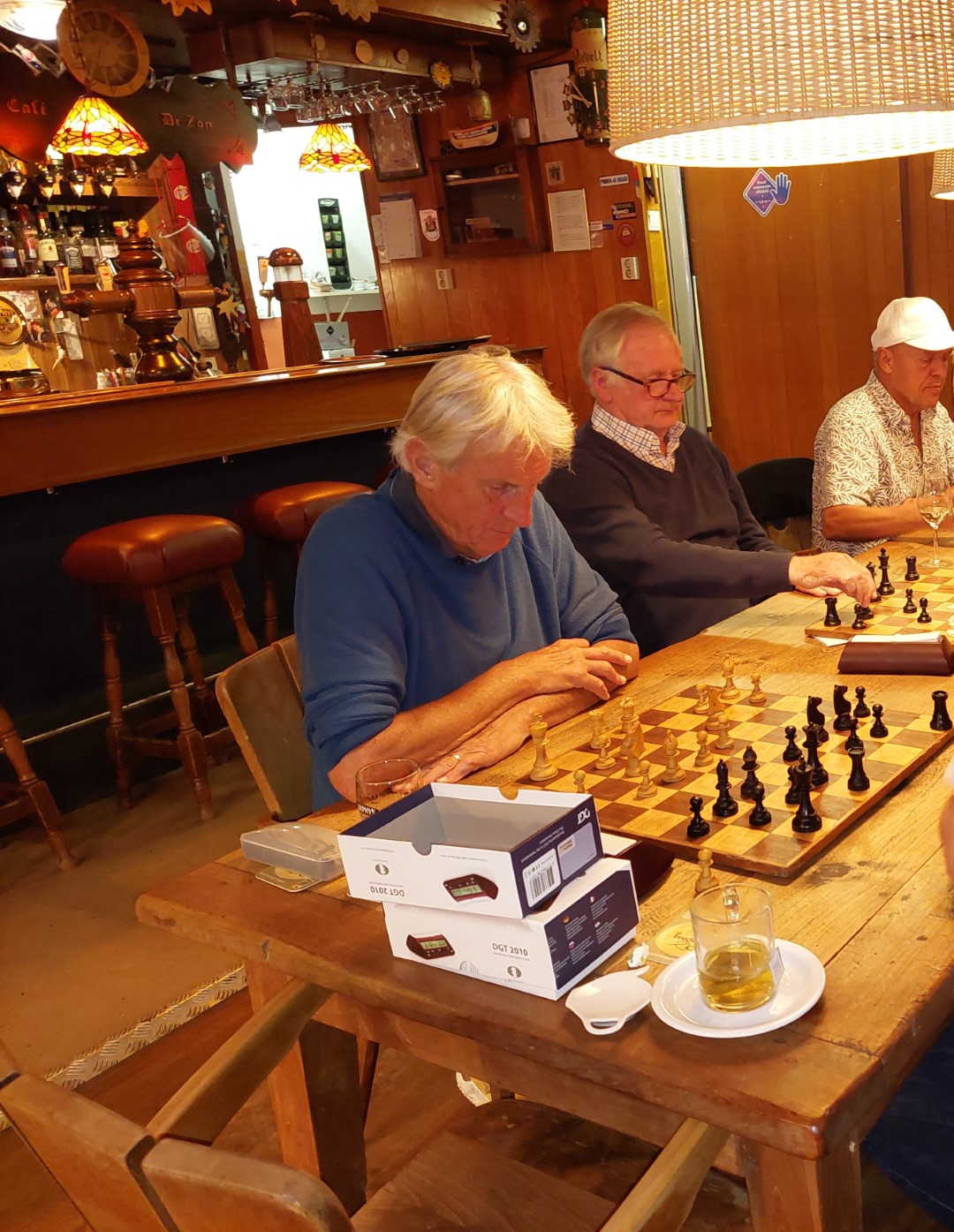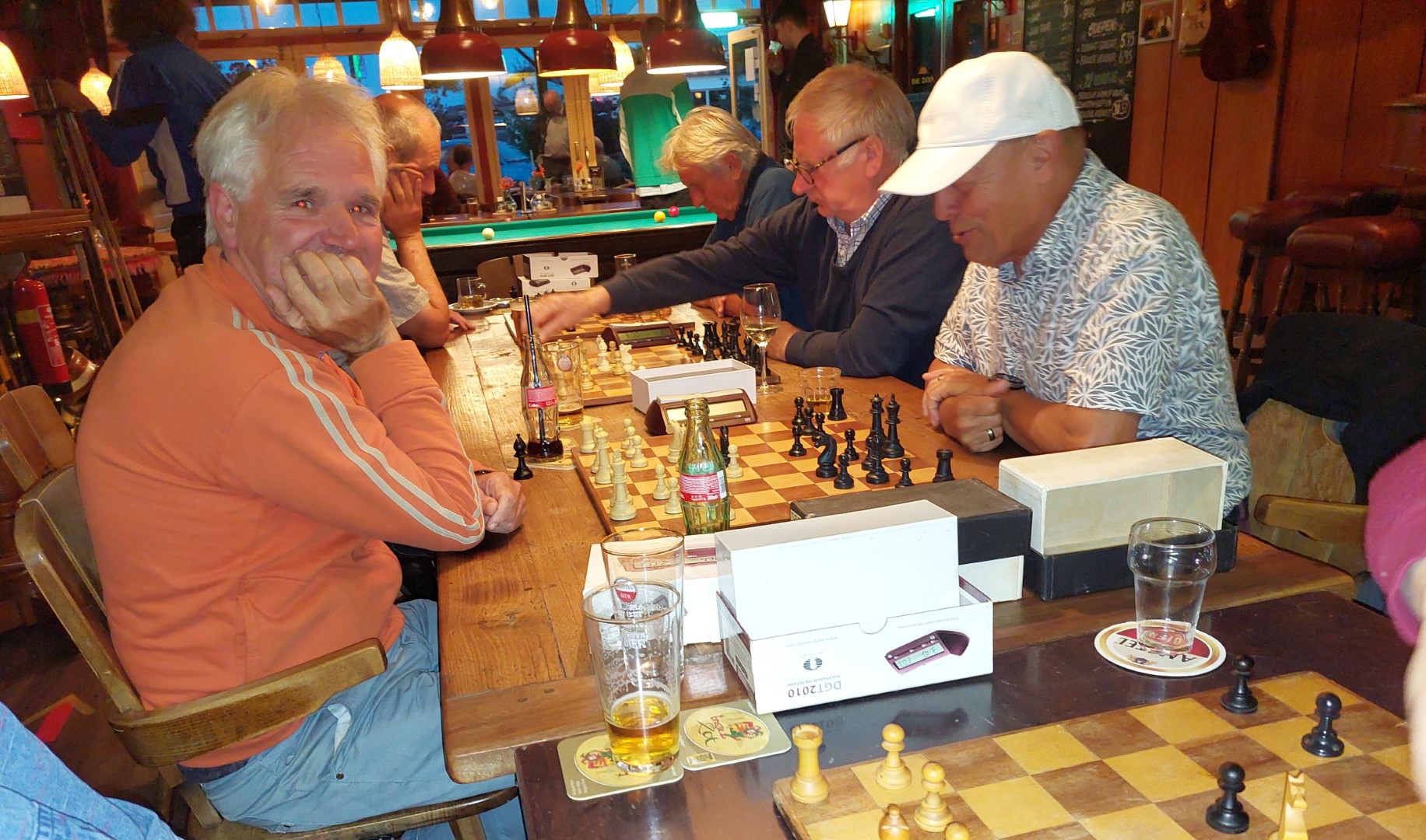 Het Zomerschaak bij Het Paard van Ree trekt altijd weer enthousiaste spelers aan uit de regio. Cor Zwaan is een graag geziene gast. Vorige week stuurde Bakkum een hoge delegatie naar Wijk aan Zee: Han Kemperink en Fons Vermeulen. Vrolijk draaiden ze mee met de 10-minuten potjes. Uitslagen en standen hebben we deze zomer niet, maar het bier smaakte er niet minder om!